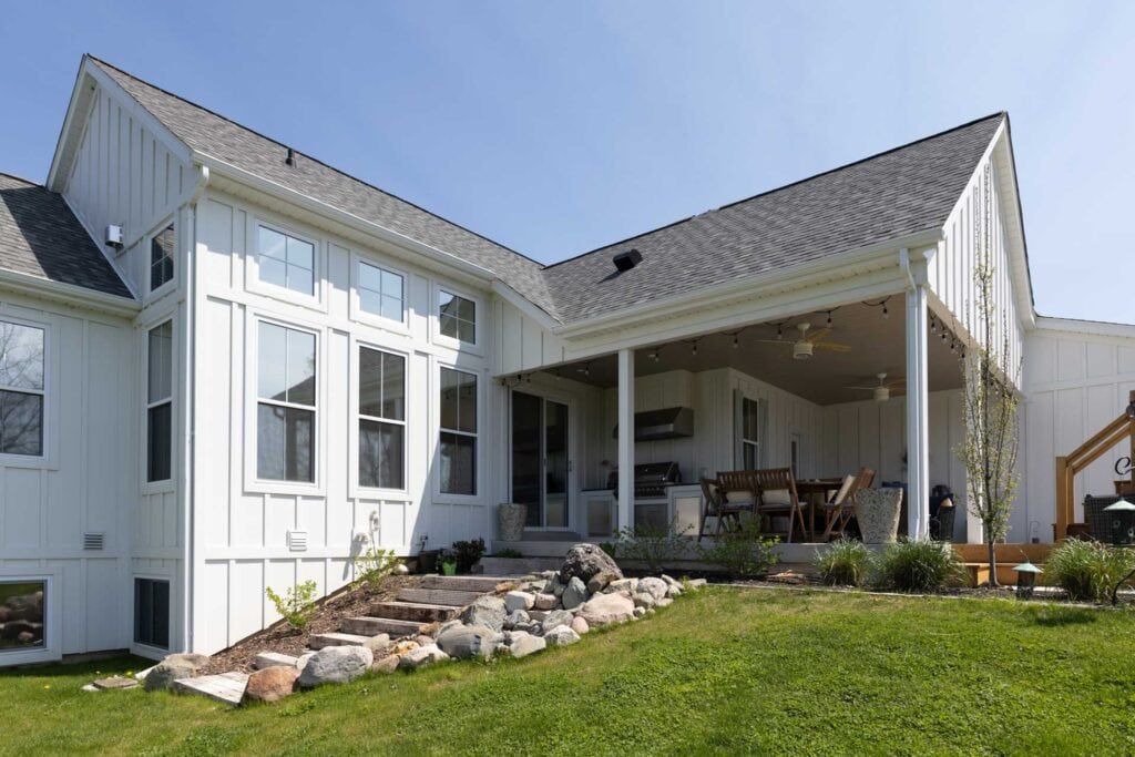 This remodel was molded to suit our clients’ lifestyle as they moved into retirement, so main floor living and room for their adult children were made a priority. The exterior style was inspired by European cottages – the large front porch and stone walkway make you feel like you might actually be at one.