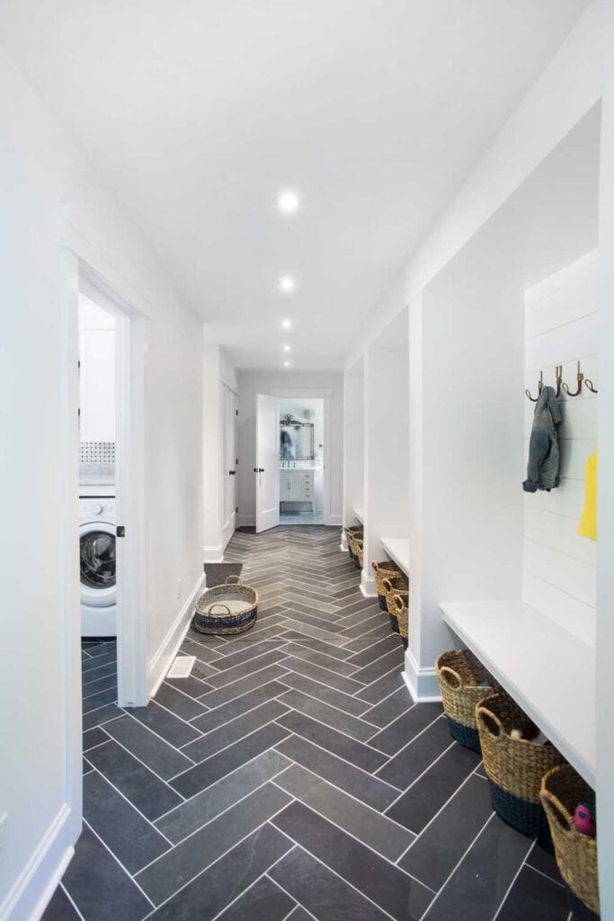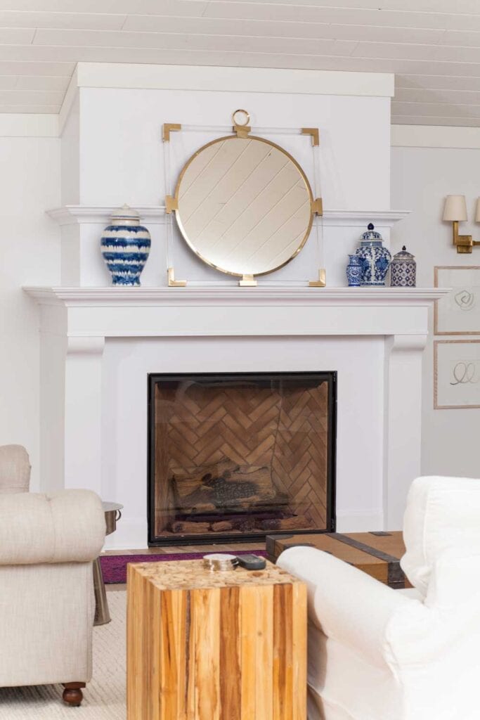 This bright, contemporary home is elevated by the balance of modern and classic design choices. The massive white quartz waterfall island and matching hood bring elegance and luxury to the kitchen. On the other hand, the custom wooden herringbone fireplaces, antique cast iron bathtub, and farmhouse oak floors add a touch of vintage charm to the home.